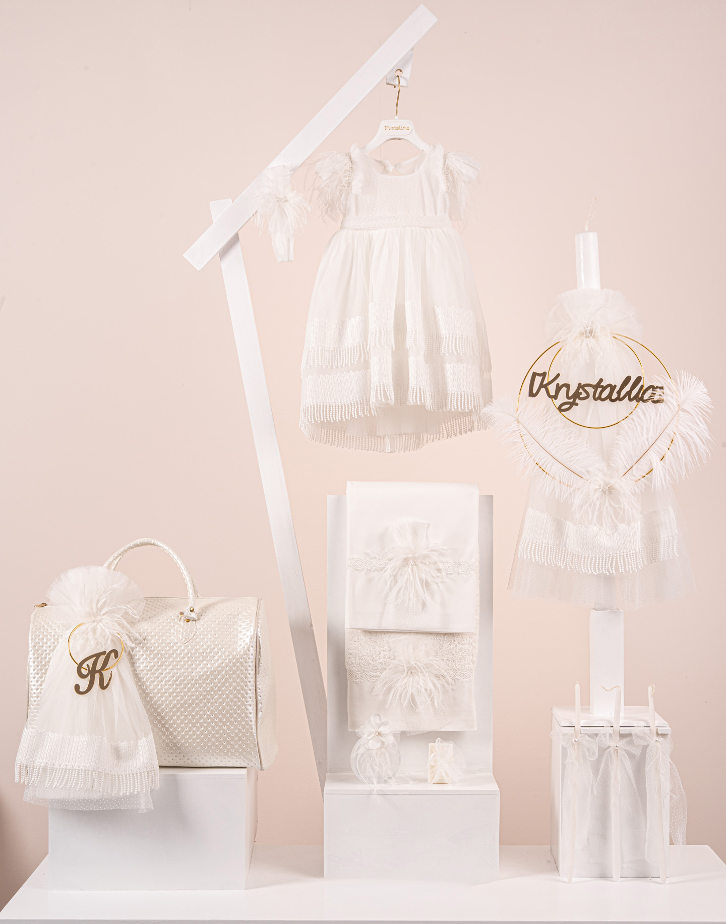 Πακέτο βάπτισης για κορίτσι Piccolino Catalina φόρεμα δαντέλα και φτερά ivory