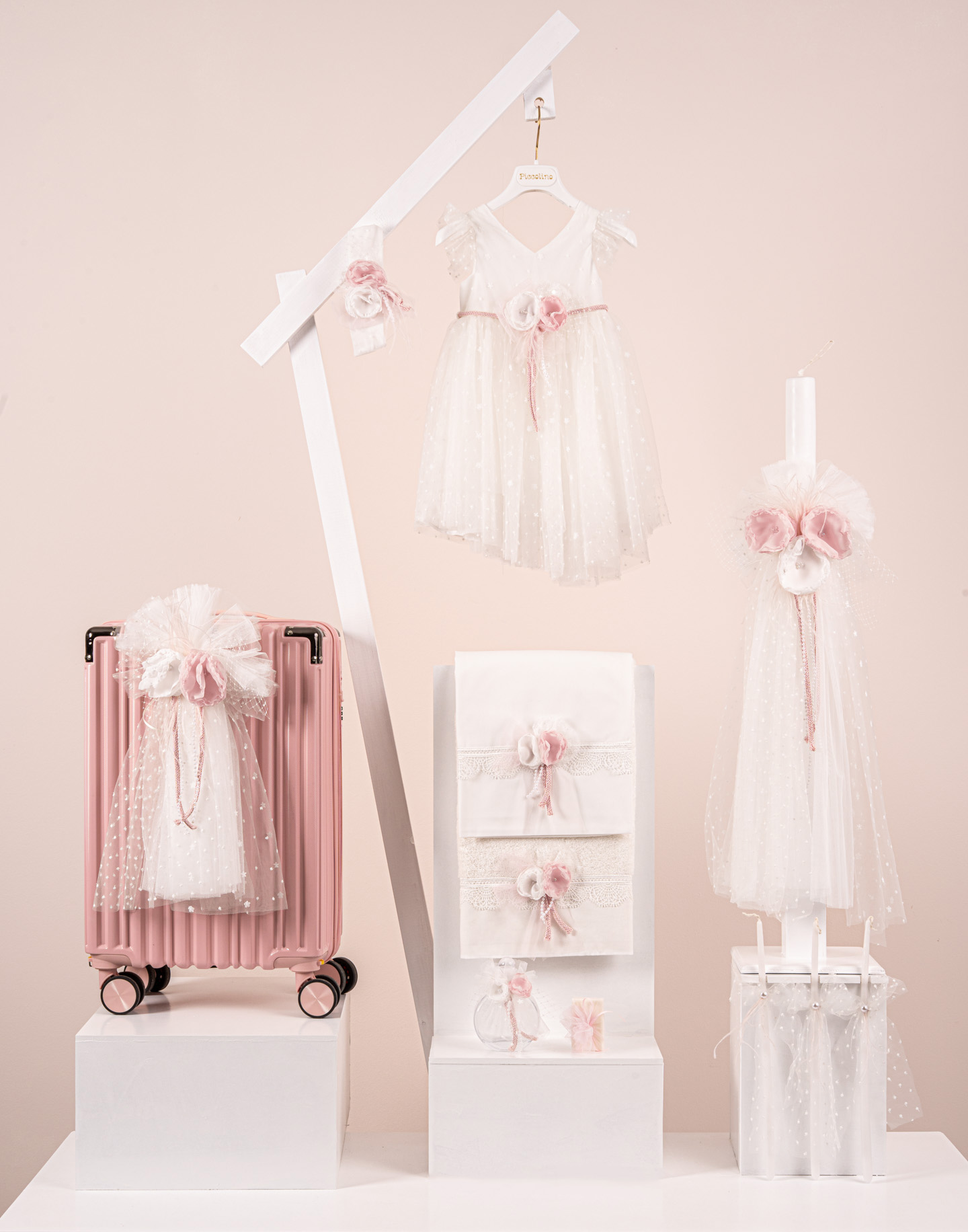 Πακέτο βάπτισης για κορίτσι Piccolino Ines φόρεμα από δαντέλα ivory (στολισμένη βαλίτσα pink)