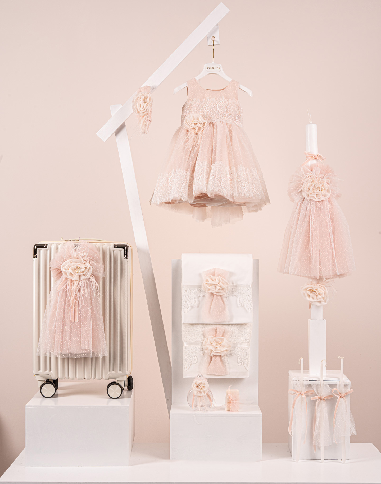 Βαπτιστικό πακέτο Piccolino Marcella peach περιλαμβάνει φόρεμα ,σετ λαδόπανα, λαμπάδα, λαδοσετ και στολισμένη βαλίτσα cream