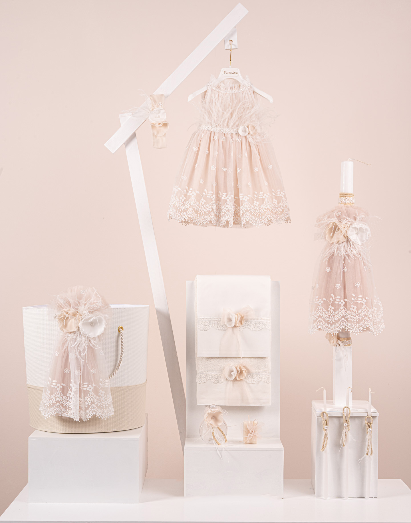 Βαπτιστικό πακέτο Piccolino Melody nude περιλαμβάνει φόρεμα ,σετ λαδόπανα, λαμπάδα, λαδοσετ και στολισμένo καλάθι δερμάτινο