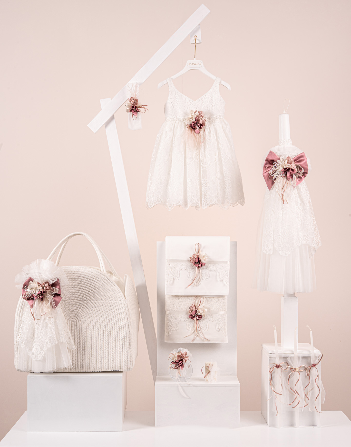 Βαπτιστικό πακέτο Piccolino Valentina ivory περιλαμβάνει φόρεμα ,σετ λαδόπανα, λαμπάδα, λαδοσετ και στολισμένη τσάντα ropes