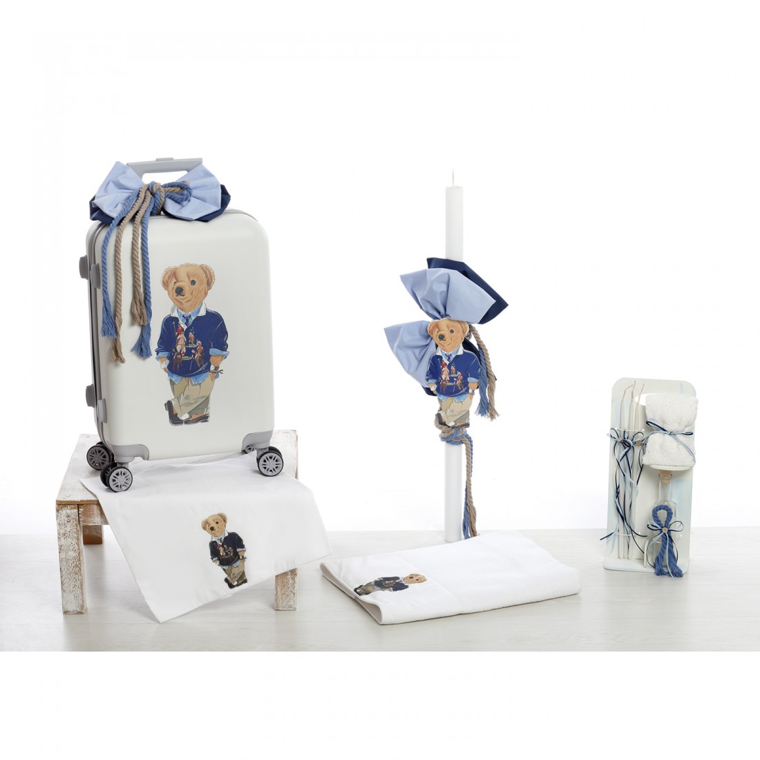 Ολοκληρωμένο premium πακέτο βάπτισης για αγόρι από τη συλλογή “Royal Polo Bear”. Μια πρόταση υψηλής αισθητικής με κλασικό χαρακτήρα και preppy ύφος, που συνδυάζει την πρακτικότητα μιας βαλίτσας τρόλεϊ με τη διαχρονική γοητεία του αρκούδου σε navy blue και σιέλ αποχρώσεις.