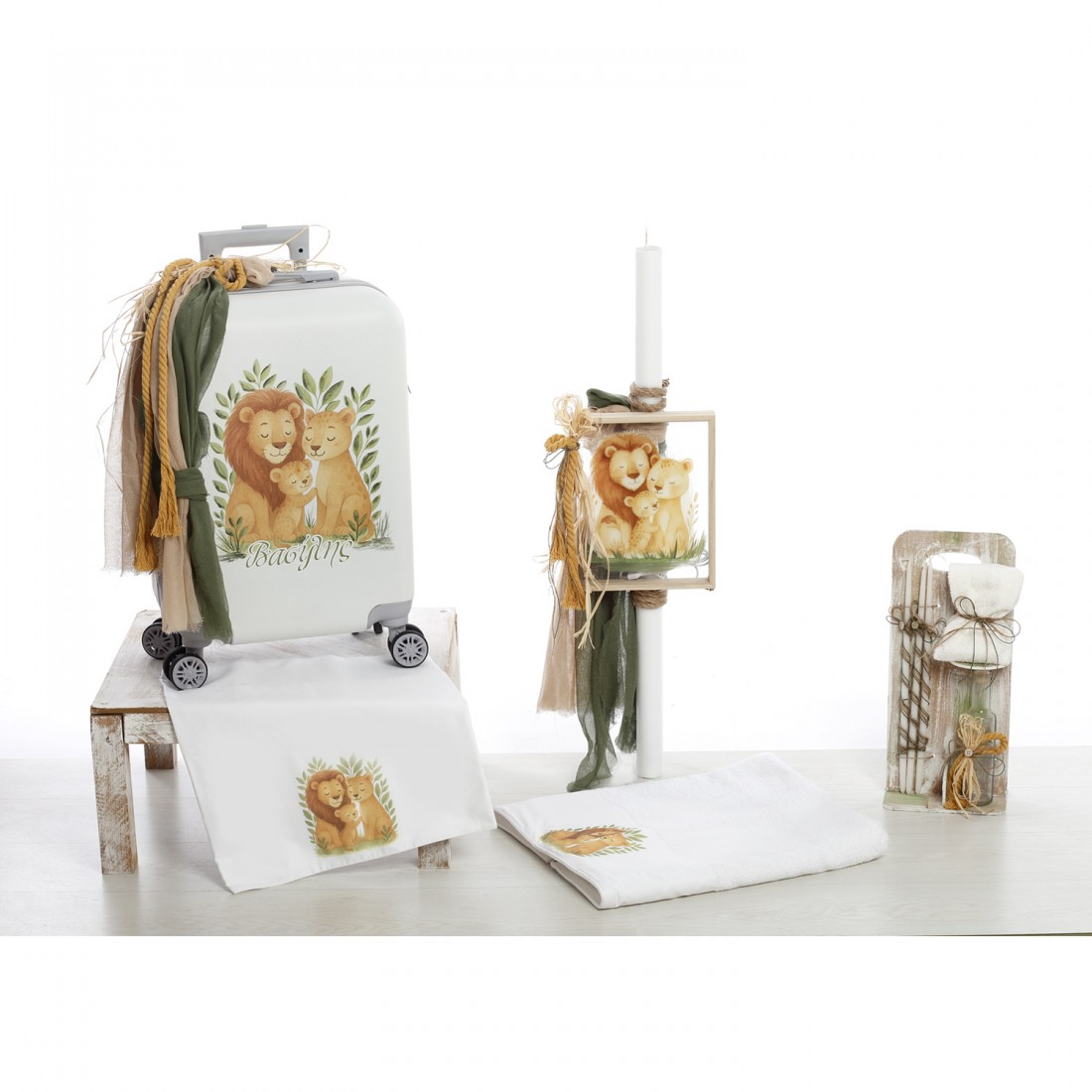 Βαλίτσα Τρόλεϊ: Υψηλής ποιότητας βαλίτσα καμπίνας με 4 διπλές ρόδες. Διαθέτει εντυπωσιακή εκτύπωση με μια οικογένεια λιονταριών (μπαμπάς, μαμά, παιδί) ανάμεσα σε φυλλωσιές, με δυνατότητα αναγραφής του ονόματος (π.χ. Βασίλης). Ο στολισμός ολοκληρώνεται με πλούσιες γάζες σε λαδί και μπεζ αποχρώσεις και χοντρά σχοινιά. (Διαστάσεις: 57cm x 40cm x 22cm).