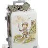 Βαλίτσα Τρόλεϊ: Υψηλής ποιότητας λευκή/εκρού βαλίτσα καμπίνας με 4 διπλές ρόδες. Διαθέτει εντυπωσιακή ζωγραφική με έναν μικρό ιππότη που κρατάει σπαθί, με φόντο ένα μεσαιωνικό κάστρο. Ο στολισμός περιλαμβάνει μεγάλους υφασμάτινους φιόγκους σε λαδί και μπεζ χρώμα, δεμένους με χοντρά γήινα σχοινιά. (Διαστάσεις: 57cm x 40cm x 22cm).