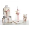 Βαλίτσα Τρόλεϊ: Πολυτελής βαλίτσα καμπίνας (σκληρό κέλυφος) με 4 διπλές ρόδες. Είναι στολισμένη με έναν επιβλητικό σατέν φιόγκο σε dusty pink απόχρωση, διακοσμημένο με σειρές από πέρλες, φτερά και τούλι. (Διαστάσεις: 57cm x 40cm x 22cm).