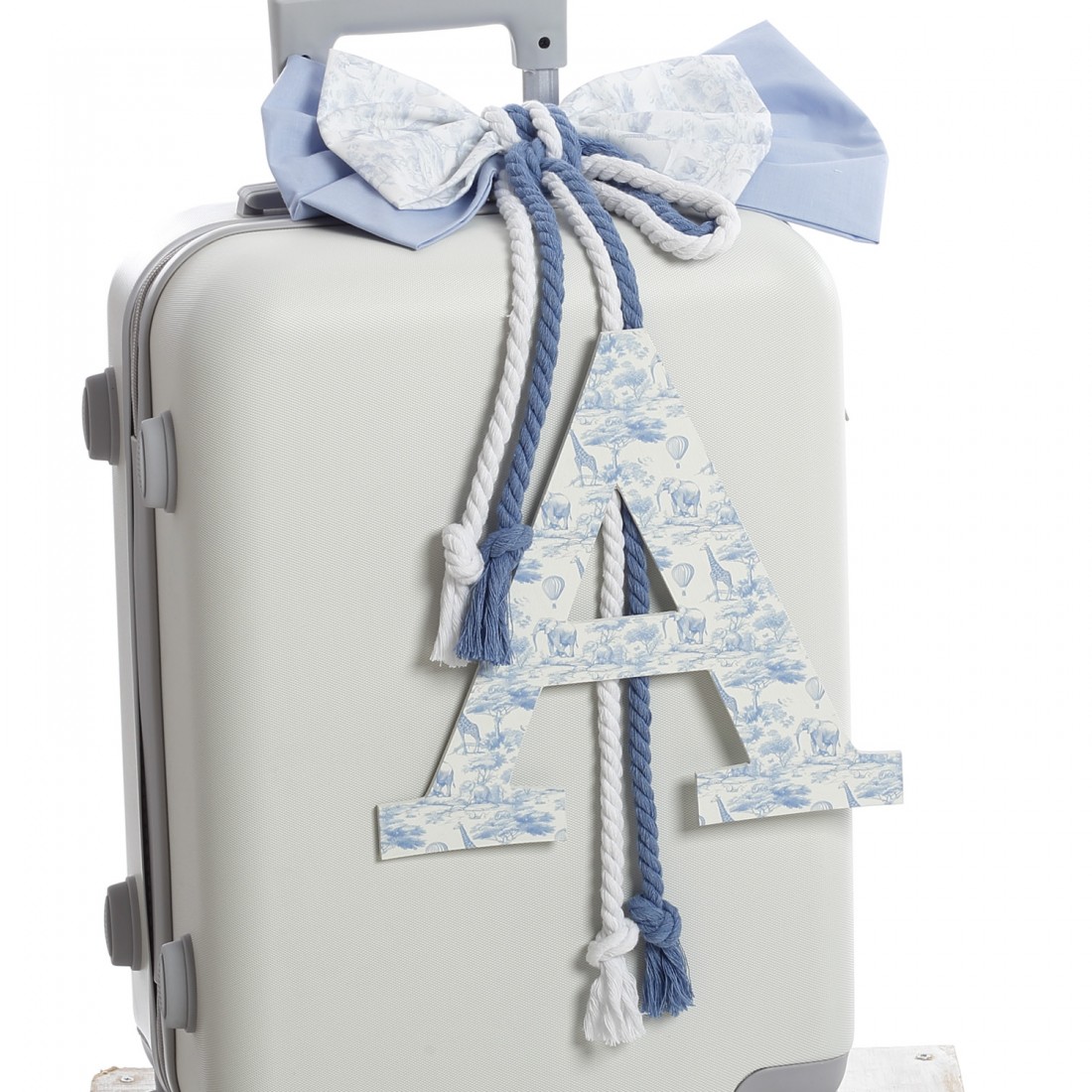 Βαλίτσα Τρόλεϊ: Υψηλής ποιότητας λευκή βαλίτσα καμπίνας (σκληρό κέλυφος) με 4 διπλές ρόδες. Ο στολισμός επικεντρώνεται σε ένα μεγάλο ξύλινο μονόγραμμα (π.χ. “Α”), το οποίο είναι “ντυμένο” με το vintage blue μοτίβο της συλλογής. Το σύνολο ολοκληρώνεται με έναν μεγάλο γαλάζιο υφασμάτινο φιόγκο και εντυπωσιακά χοντρά σχοινιά σε λευκό και σκούρο μπλε χρώμα. (Διαστάσεις: 57cm x 40cm x 22cm).