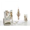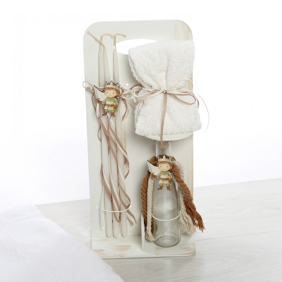 Σετ Λαδιού: Λευκό ξύλινο stand που περιλαμβάνει μπουκάλι λαδιού, σαπούνι και 3 κεράκια, όλα ασορτί διακοσμημένα με σχοινιά και μικρές φιγούρες ιπποτών.