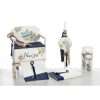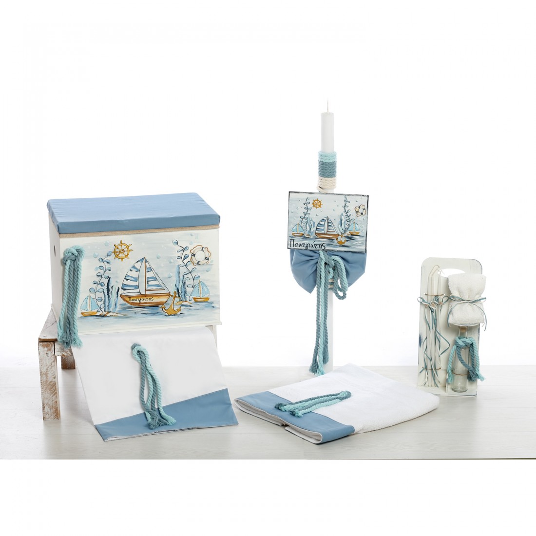 Λαδόπανα: Πλήρες σετ (πετσέτες, εσώρουχα) από 100% βαμβάκι, με φάσα σε μπλε αποχρώσεις και διακοσμητικά χοντρά σχοινιά, εναρμονισμένα με το ναυτικό ύφος του σετ.