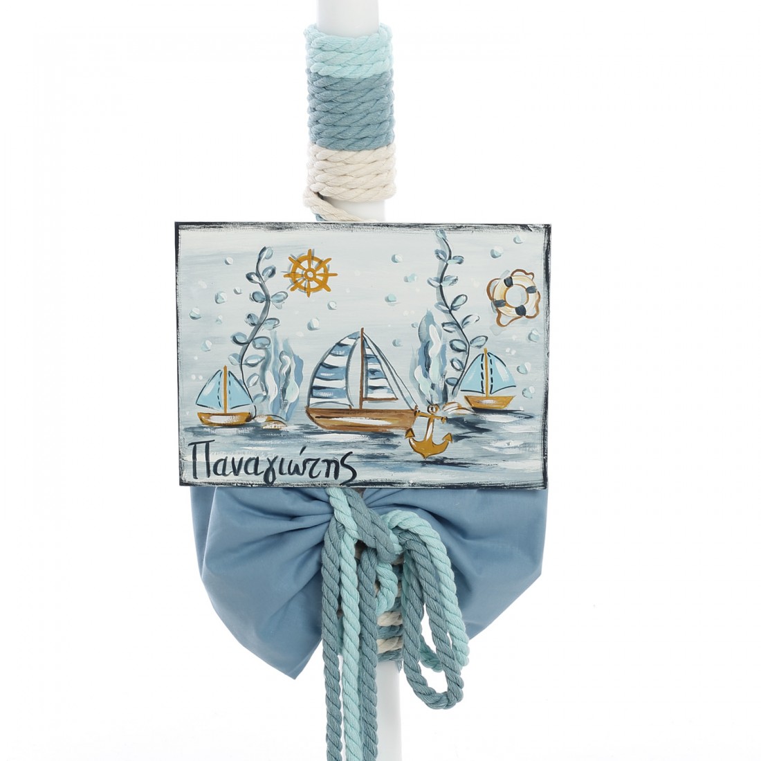 Λαμπάδα: Στολισμένη με μεγάλο γαλάζιο υφασμάτινο φιόγκο, κρεμαστά τιρκουάζ σχοινιά και ένα ξύλινο καδράκι (τελάρο) με την αντίστοιχη ζωγραφιστή παράσταση του ιστιοπλοϊκού.