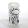 Σετ Λαδιού: Λευκό ξύλινο stand που περιλαμβάνει μπουκάλι λαδιού, σαπούνι και 3 κεράκια, όλα ασορτί διακοσμημένα με λεπτά μπλε σχοινάκια και μικρά ξύλινα αυτοκινητάκια.