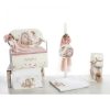 Σετ Λαδιού: Ξύλινο stand σε ροζ απόχρωση που περιέχει μπουκάλι, σαπούνι και 3 κεράκια, όλα ασορτί διακοσμημένα με floral λεπτομέρειες και κορδέλες.