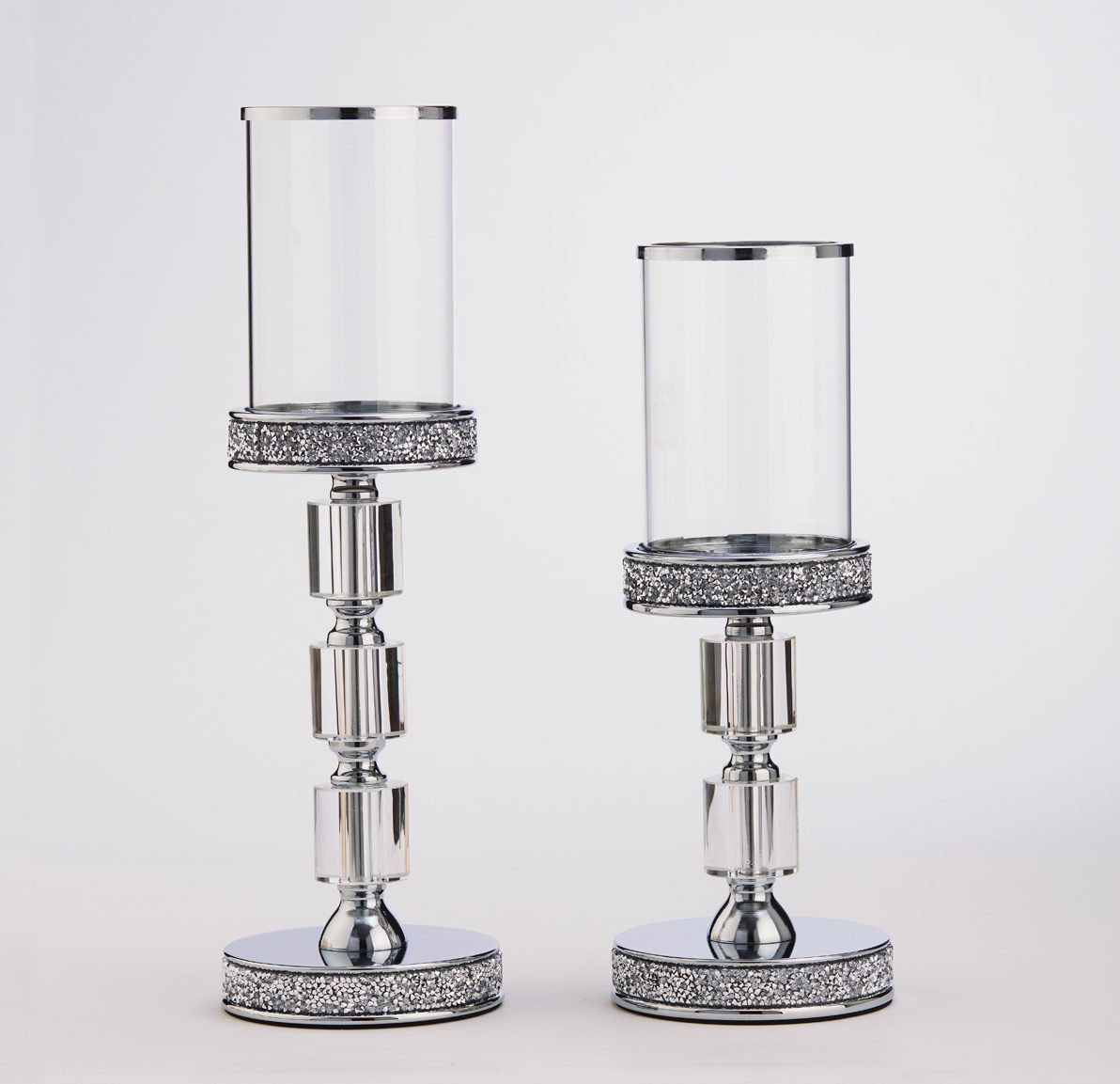 Σετ λαμπάδων γάμου με κρυστάλλινα κηροπήγια, ασημένιες λεπτομέρειες.