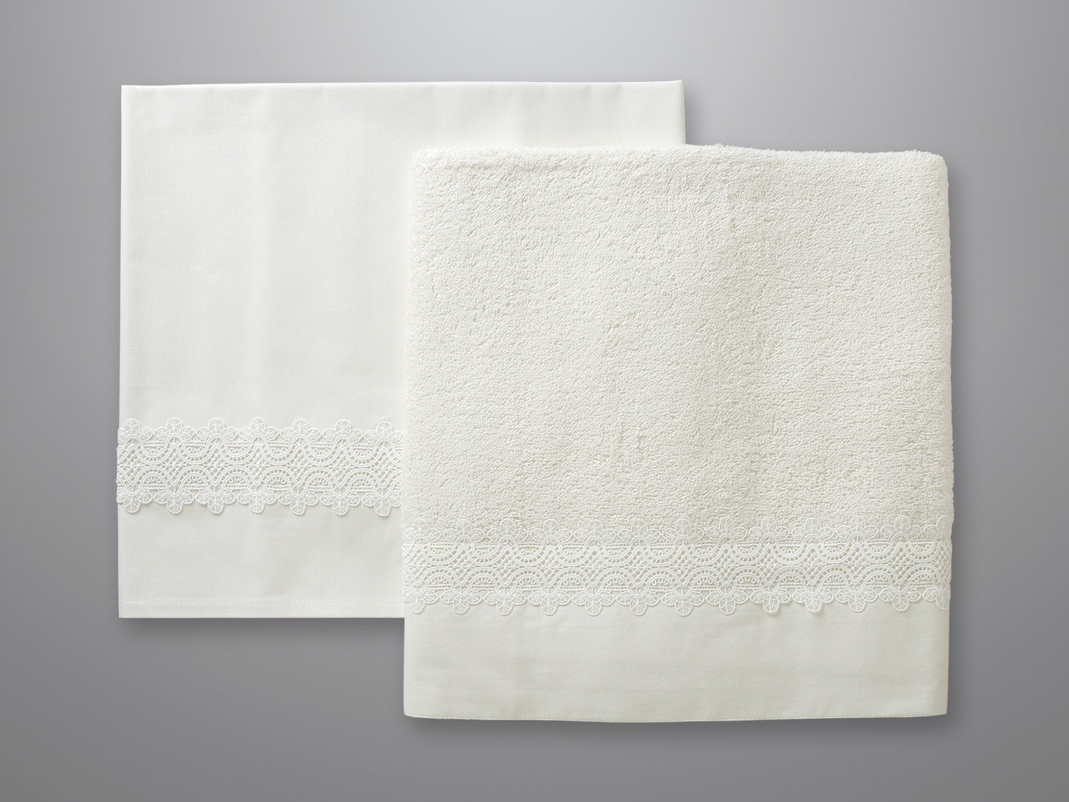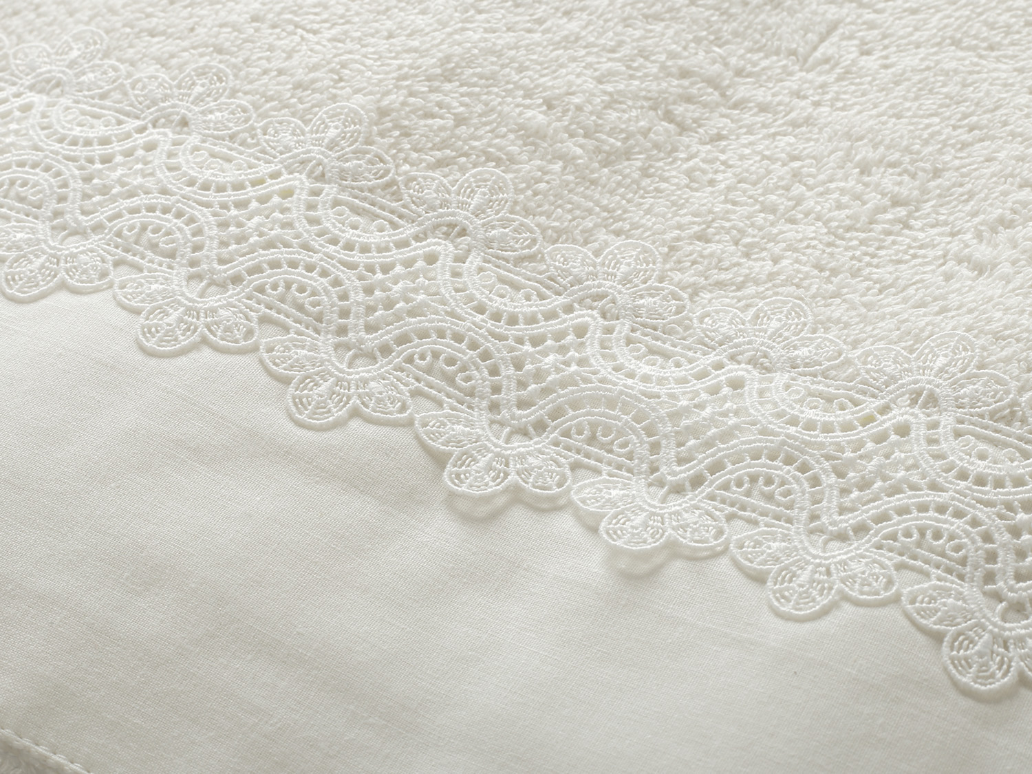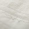 Εκρού πετσέτα με μια δαντελένια τρέσα, διαστάσεων 1,40m x 0,80m. Η τρέσα είναι ραμμένη κατά μήκος της πετσέτας.