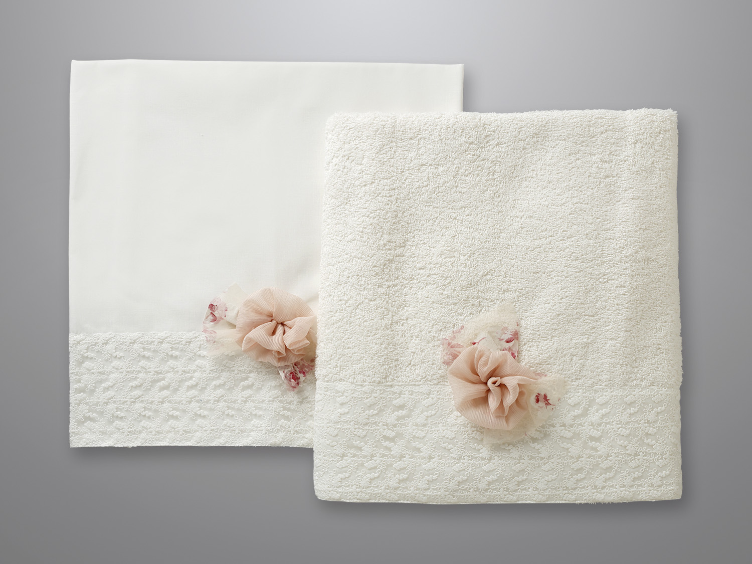 Εκρού λαδόπανο με μεγάλη φάσα εκρού δαντέλα με ραμμένο λουλούδι πάνω σε τυπωμένο τούλι.