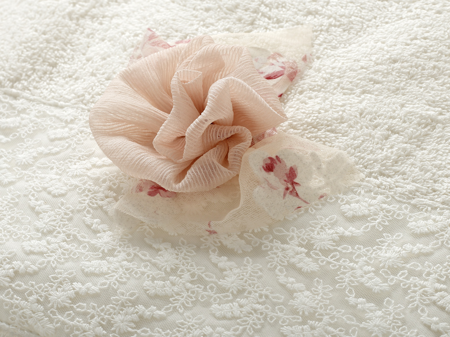 Πάνω στη φάσα είναι ραμμένος ένας φιόγκος από τυπωμένο τούλι και ένα λουλούδι από μουσελίνα.