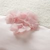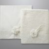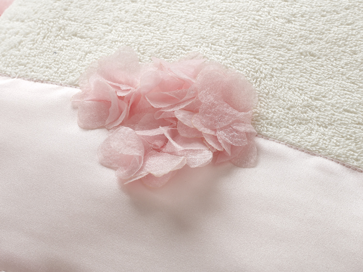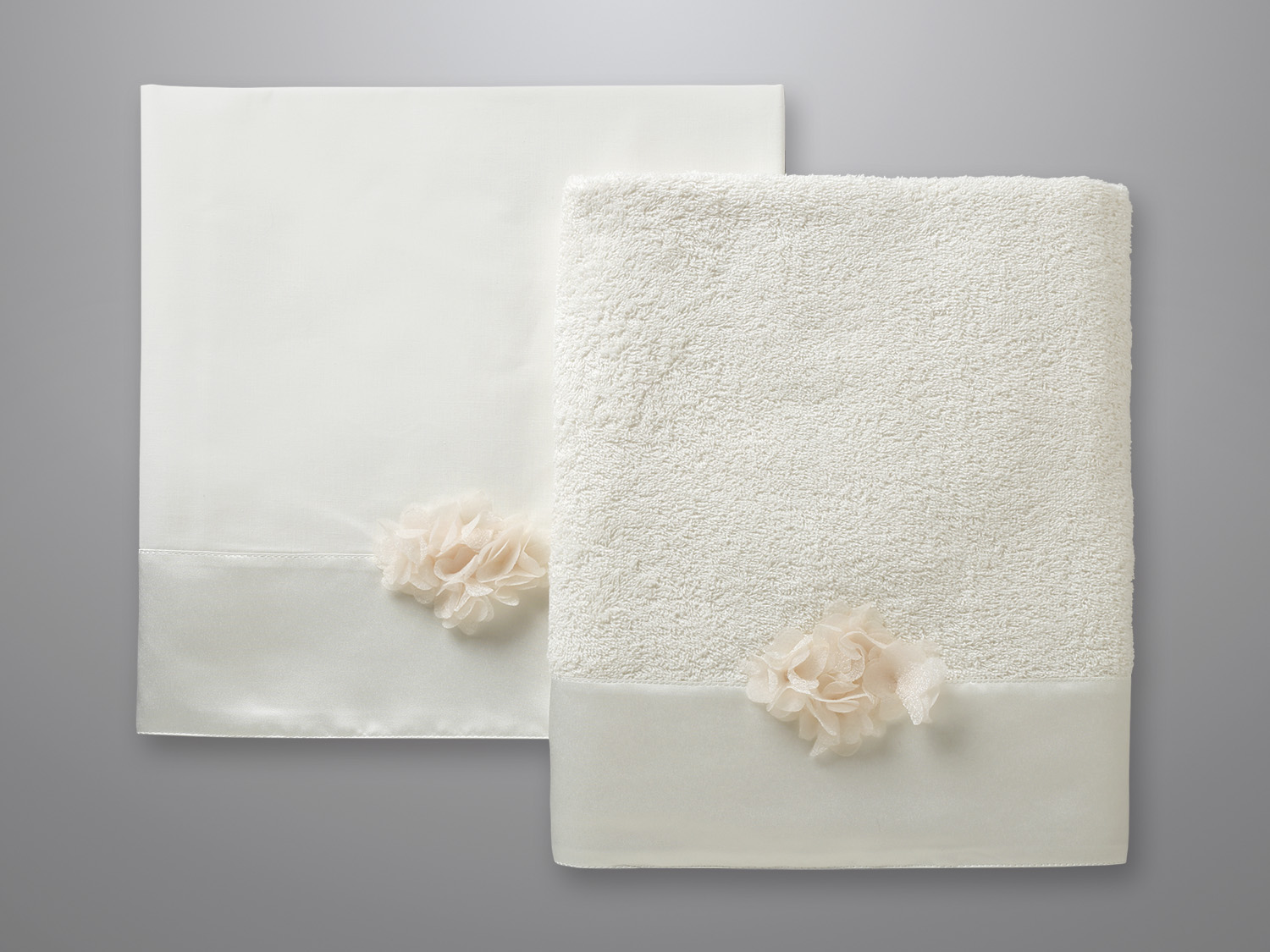 Εκρού πετσέτα με μια μεγάλη φάσα από εκρού σατέν, διαστάσεων 1,40m x 0,80m. Πάνω στη φάσα είναι ραμμένα μπεζ λουλούδια.