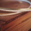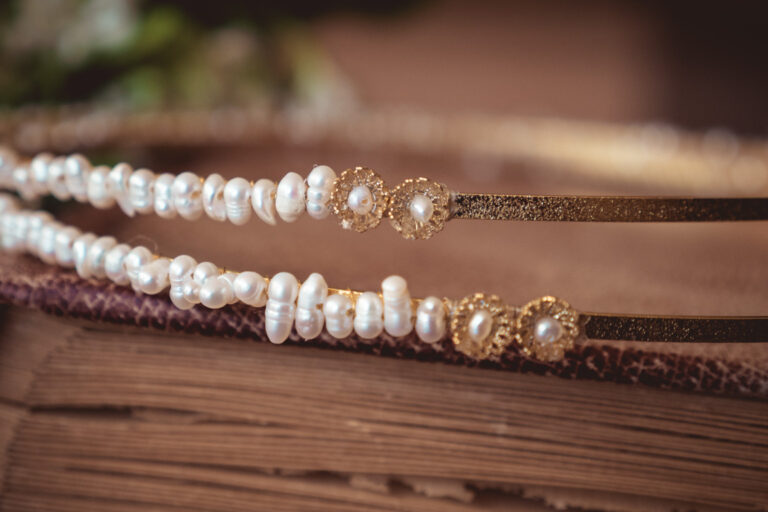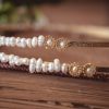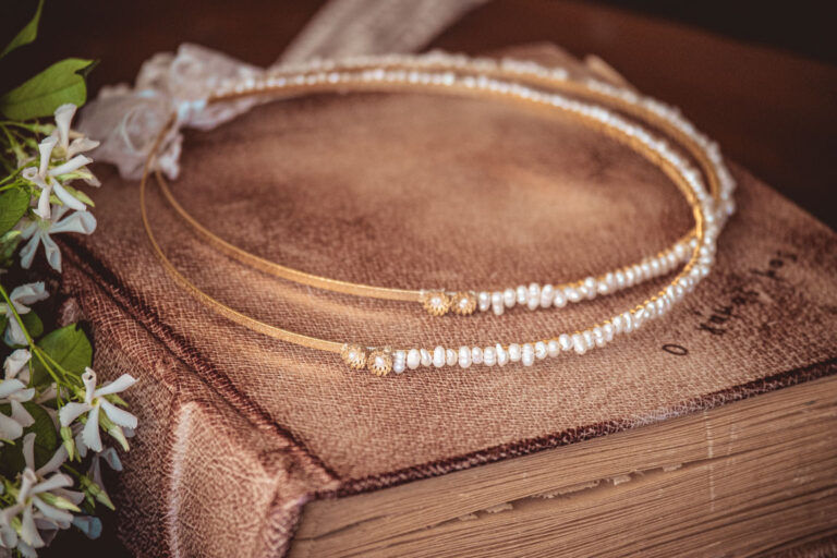 Επίχρυση βέργα πλακέ με επεξεργασία διαμαντοβολής πλεγμένη με λευκά μαργαριτάρια του γλυκού νερού ,