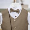 Ένα ιδιαίτερο βαπτιστικό σύνολο σε ταμπά και φυσικό μπεζ αποχρώσεις, που συνδυάζει φυσική αισθητική και κομψό σχεδιασμό. Το σετ περιλαμβάνει υπόλευκο λινό πουκάμισο με γιακά και διακριτικά κουμπιά σε καφέ απόχρωση, δημιουργώντας μια κομψή και φωτεινή βάση για το σύνολο. Συνδυάζεται με γιλέκο με κουμπιά και διακοσμητικές τσέπες, που προσθέτει στυλ και χαρακτήρα στην εμφάνιση, ενώ το παπιγιόν ολοκληρώνει αρμονικά το σύνολο με μια κομψή λεπτομέρεια. Το σύνολο συμπληρώνεται από παντελόνι τύπου βράκα σε φυσικό μπεζ, με άνετη γραμμή, ρεβέρ στο τελείωμα και διακοσμητικό πλεκτό κορδόνι στη μέση, προσφέροντας άνεση και κομψότητα.